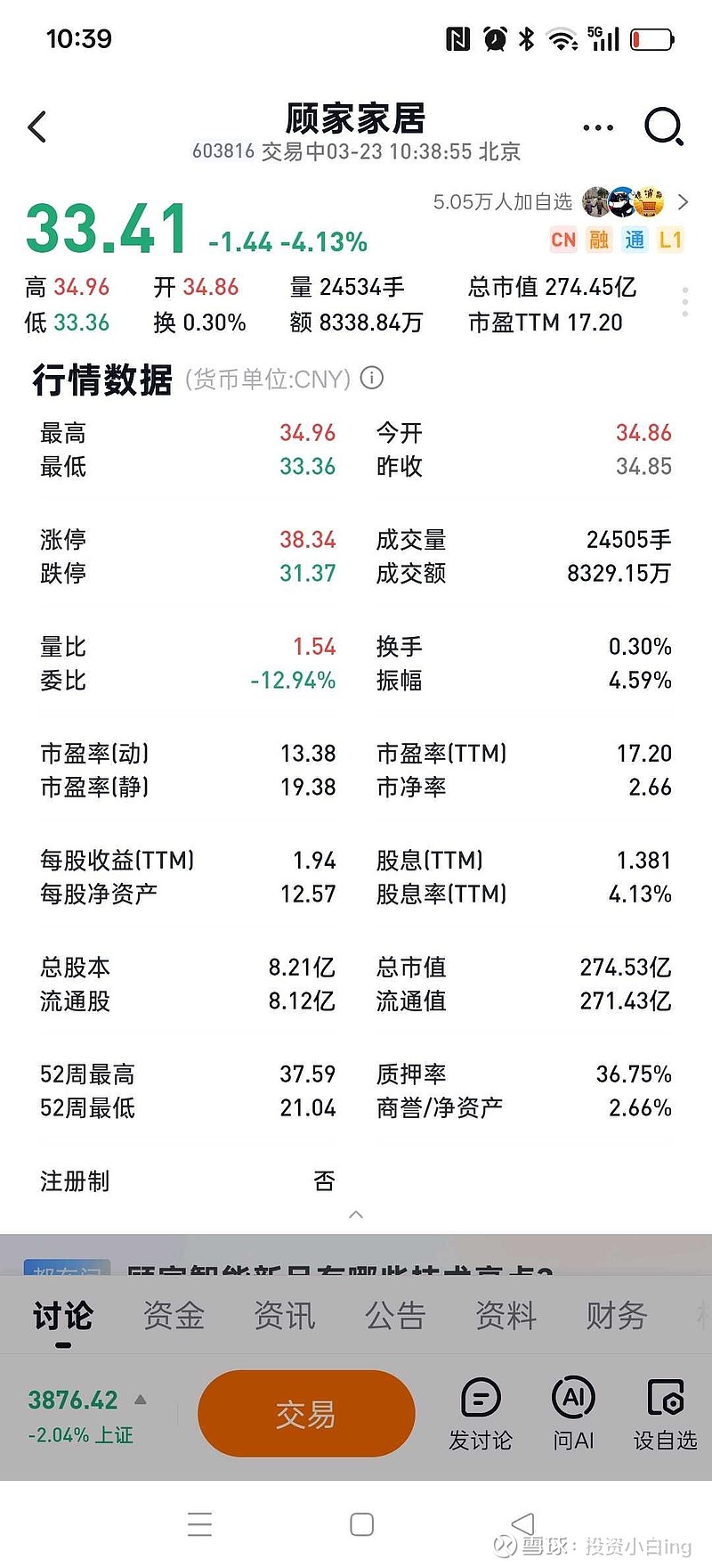 哐哐跌换手率还是只有0.3%;坚定认可顾家价值,不过我现在的选择是持股不动,不加不减;跌到32左右考虑买一点儿,涨到36.6的话会卖一点儿;不到目标价格就躺着等分红了