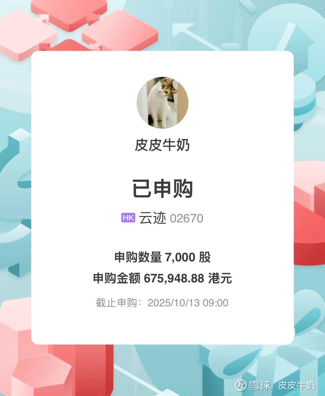 云迹,共2.76万手,13号9点截止申购,14号下午出结果释放资金