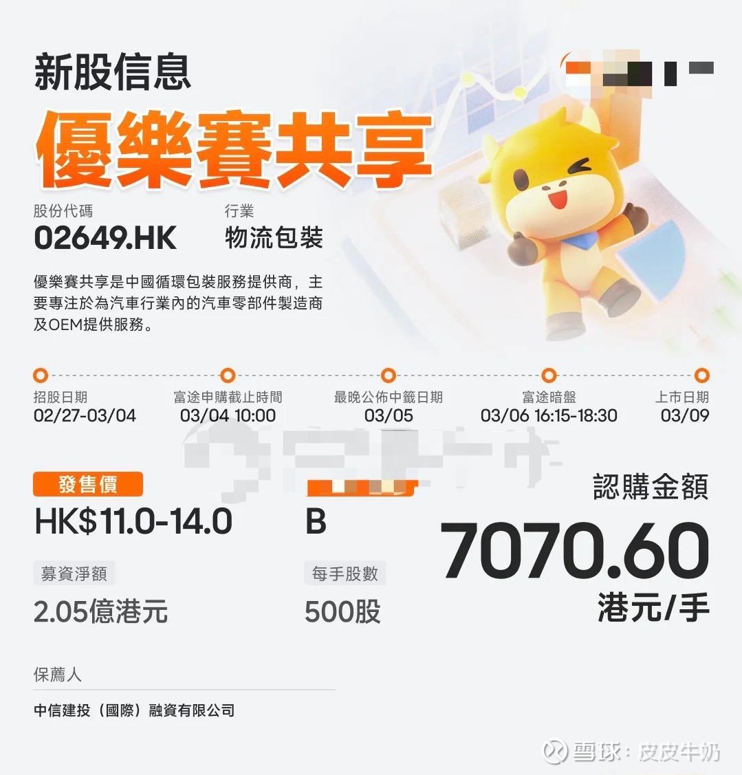 【招股价】11-14HKD;每手500股;每手7070.6HKD