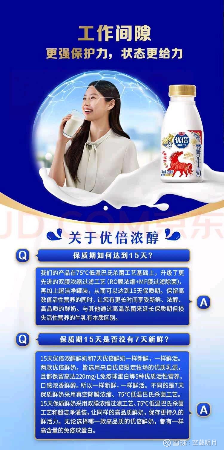 该双膜过滤技术应用于光明优倍中,结合75℃巴氏杀菌工艺,保留高达200mg/L免疫球蛋白、45mg/L乳铁蛋白、1500U/L乳过氧化物酶等5种鲜活营养,且延长保质期至15天。(其实光明在更早的时候推出光明致优,引进的法国膜过滤技术。不过当时因为过滤效率和成本的问题,普及度不高。)
