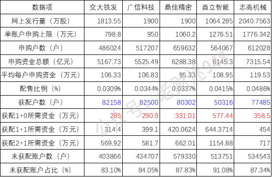 首先看看申购与获配总体情况,自交大铁发以来,几个新股申购与获配重要数据列表如下: