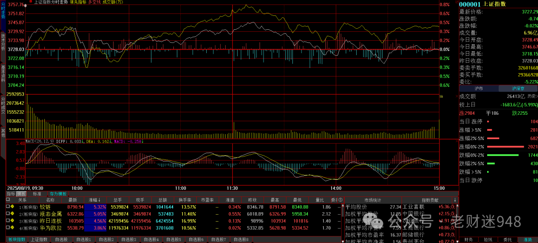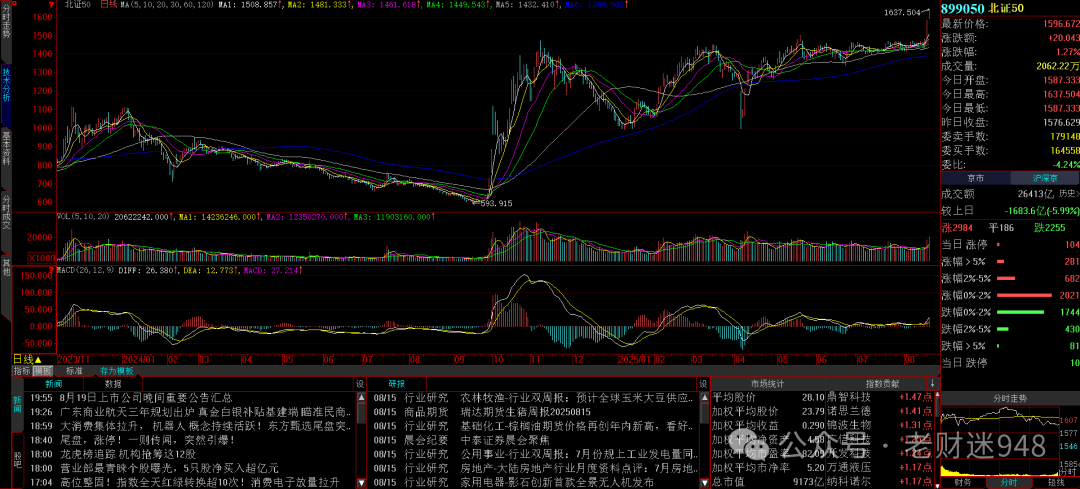 卖光盘的小生意被淘汰了,我这个股市老韭菜这回也有了被行情和初生牛犊推下车的危机感了。今天,A股在昨日强势普涨的基础上,指数和不少个股基本都微微低开,随即就开始向上攻击,与我预想的一样,在银行股等权重股反弹下,指数分时图上形成白上黄下局面,迅速形成了一波“A”字走势,接近上午10:20左右才逐渐重震荡向上,至午后,还是逐渐走软,个股出现 分化,除北证50、创业板50和中证1000等少数指数红盘外,多数指数以绿盘报收,只是跌幅很小,盘面上红盘个股数量略多于下跌个股数量。板块上不是特别聚集,华为概念、光电子、CPO、白酒等板块领涨,中芯国际、半导体、光刻胶、军工电子、券商、CRO等下跌。市场平均股份小幅上涨,成交金额比昨日减少近1700亿元。