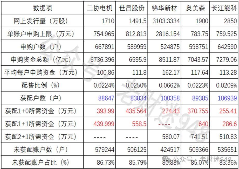 由于我预测时奥美森申购配售具体数据公告还没有出来,所以预测如果顶格翻车的话需要255万元以上申购账户超过11万户甚至接近11.5万户,而陪跑账户是按50万户预测,比奥美森预测时用的52万户减少,主要是考虑获配门槛下降。但实际情况完全出乎我预料,首先是奥美森陪跑账户已接近51万户,其次是371万元以上账户仅8.9万多户,而长江能科255万元以上实际获配户数不到10.7万户,仅和我预测的顶格不翻车情况下的获配户数差不多,而陪跑账户高达535651户,比门槛 稍高的锦华新材增加了11.1万多户,比我预期也超出了3.56万户。仅超预期的这些陪跑账户就导致申购资金增加近70亿元。没有这将近70亿元的贡献,申购资金总额就正好低于顶格翻车的临界值。