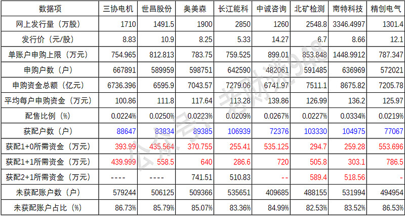 根据公告数据的计算和相关信息,精创电气网上申购总户数572021户,申购资金总额7205.78亿元,配售比例0.0219%,最终获配户数77067户,按比例每获配一手“正股”需申购553.696万元,获配碎股的门槛为786.5万元(需按申购时间优先分配),未获得配售的账户(陪跑账户)数量为494854户,占申购总户数的比例86.53%。