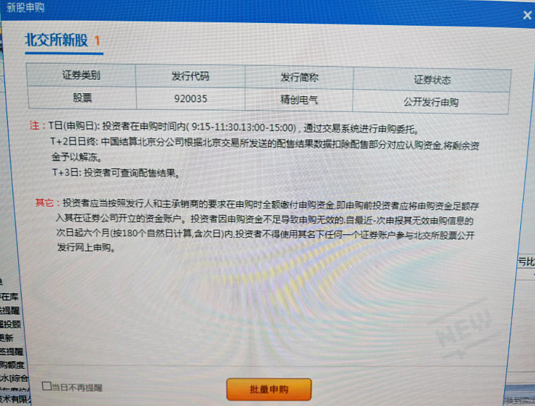 从上面表格可以看出,这次申购户数相对于南特科技减少了将近6.5万户,说明参与南特科技申购的不少账户还是清楚规则的,并没有认为南特科技是“幸运中签“而继续申购烦死人了电气,但是,申购户数仍比申购预期获配门槛基本相当的中诚咨询多约9万户,申购后在论坛上看到抱怨申购将近100万元、200万元甚至还有申购400多万元没有“中签”的,而像下图这样的部分券商的交易软件在申购当日投资者登录时自作聪明弹窗提示新股申购“功不可没”。