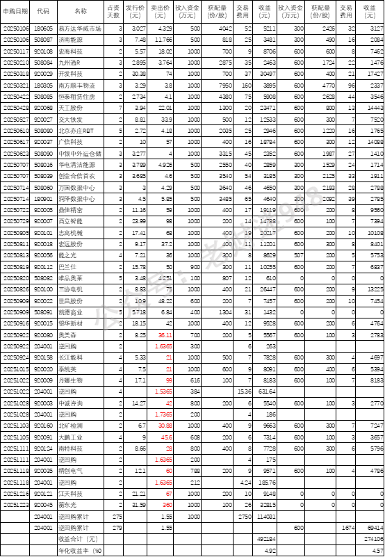从以上结果看,600万元资金档全年低风险投资收益率年化仅有4.5%多一点的样子,资金利用效率高一些的1000万元档也不到5%,只有4.9%多一点点(这还是假设新股申购时能分户时都分户申购且基本都拿到碎股,卖出除了大鹏工业按第一次临停价卖出,其他基本都是按相对较高的价格卖出)。而且,随着北交所新股申购资金越来越多,获配门槛越来越高,上半年还能够测算一下子的300万元档,第三季度已没有什么机会了,前三季度测算时的400万元档,四季度时已多数都没法参与了,12月份的2只连600万元也无法参与了。