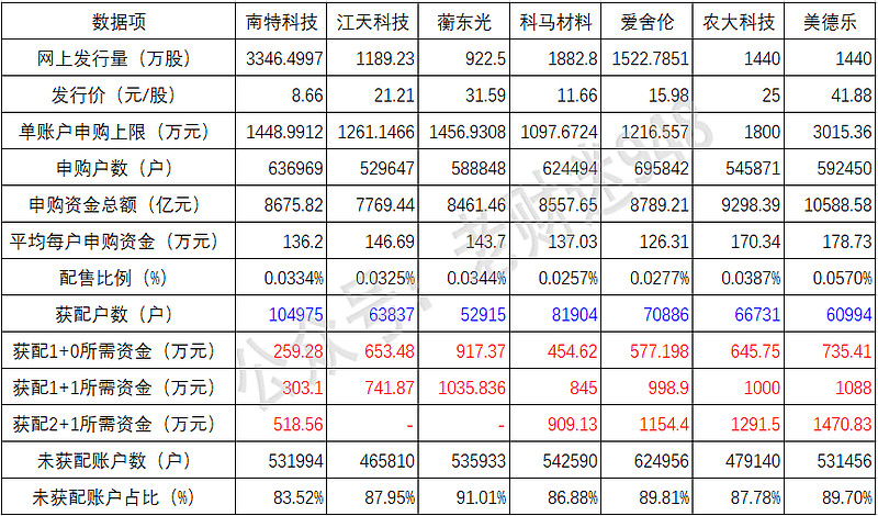 从上面表格可以看出,自蘅东光以来非理性快速增加的申购户数,农大科技申购时断崖式下降,这次又有所反弹,比农大科技又增加了近4.66万户,而未获配账户增加超过5.23万户,所以可以大致认为,这次增加的几乎全是陪跑账户;获配账户数量60994户,获配账户数量略少于申购前预测的6.2至6.4万户区间。