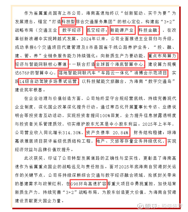 此次获奖,印证了公司转型发展道路的正确性与坚实性,更彰显了海南高速作为省属重点国企的战略远见与责任担当。面对2025年底海南自贸港封关运作的关键节点,公司将持续深耕综合交通与数字经济融合领域,抢抓封关带来的基建需求与政策红利,在G98环岛高速扩容等重大项目中勇挑重担,加快培育新质生产力,持续完善“3+2”战略布局,为股东创造更大价值,为海南自贸港建设贡献更大国企力量。