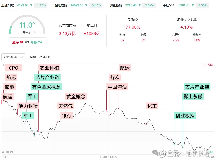 三大指数集体收跌,深成指高开低走跌超3%,创业板指跌超2%,沪指盘中突破1月14日的阶段高点后震荡回落。沪深两市成交额3.13万亿,较上一个交易日放量1088亿。