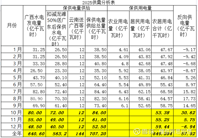 这里核心是不平衡,这两天下了点功夫,把广西保障性供电和用电量化分析了一下,2025年广西反向供电量为57.92亿度,主要原因是6-10月云南东部、贵州西南部、广西西北部来水大幅度偏丰,龙滩电站建成后首次满蓄,天生桥一级电站多次弃水,10月在满发的情况下发生持续大量弃水,红水河、郁江流域水电发电量大增,同时各主要水库保持满蓄水位。