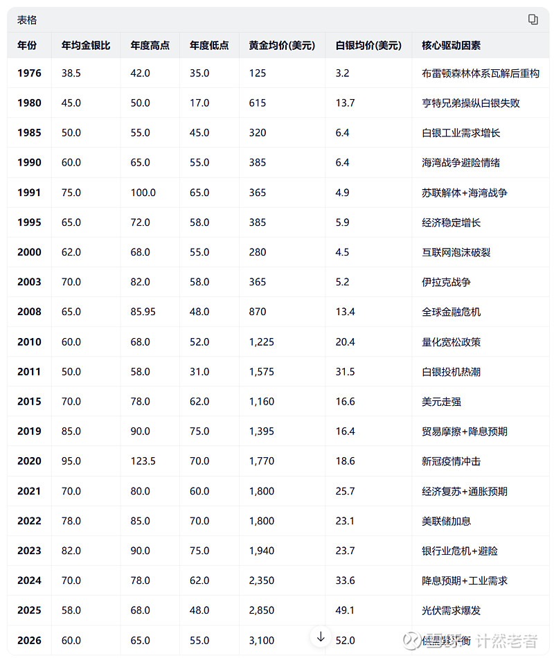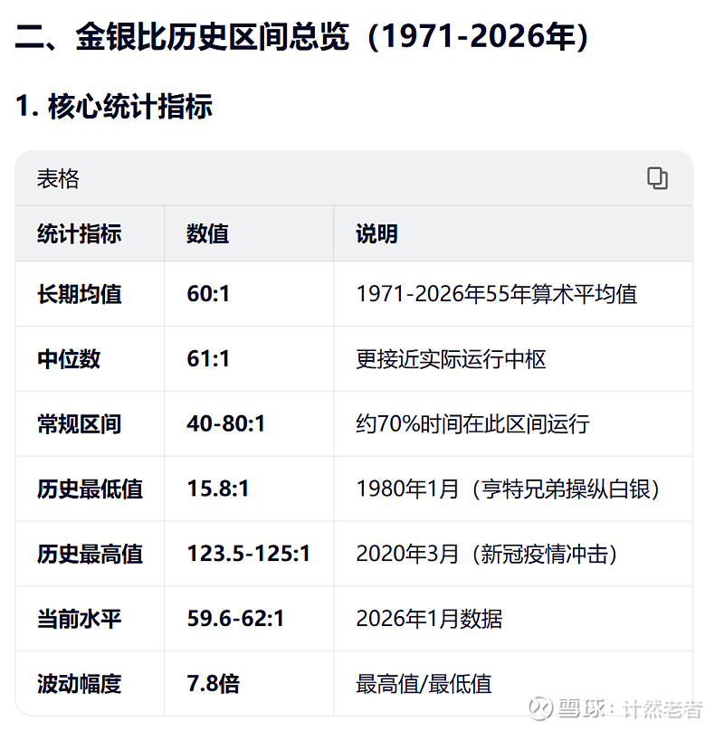 以上是55年来的金银比统计数据,跨度多个周期,我觉得还是具备相当强的可参考性。