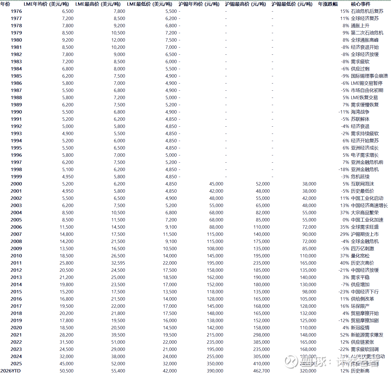锡也是类似的逻辑,我们先看一下过去50年锡价的波动区间: