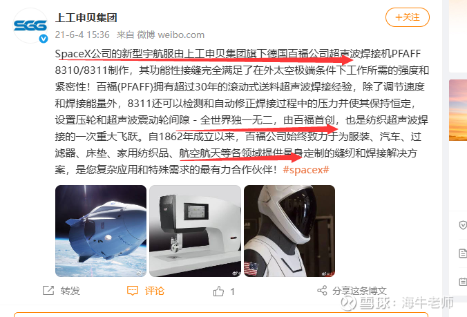 公司董事长张敏在近期采访中透露:" 从 ' 缝衣服 ' 到' 缝飞机 ',再到 ' 缝宇航服 ',上工申贝的材料连接技术正在向太空领域实现质的飞跃 "。