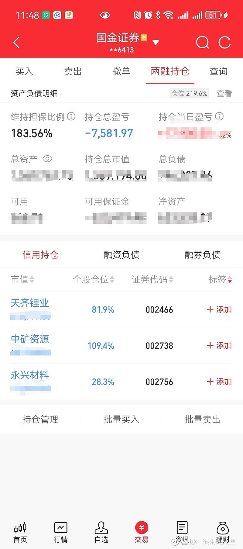 $天齐锂业(SZ002466)$ $中矿资源(SZ002738)$ $永兴材料(SZ002756)$ 仓位既态度,今天融资账户仓位打满,持有2-3年,人生下半场是会所嫩模还是下海干活,就看这次了。不用担心爆仓,还有2万股亚盛医药在其它账户呢,随时可以补充质押