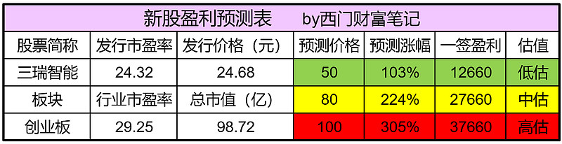 三瑞智能今日(3月27日)申购,属于创业板,一签中签市值 12340元,顶格申购需要配置市值6万元,预估涨幅 103% ~ 305%,预计一签盈利 1.3 ~ 3。8万元,留言许愿中签。