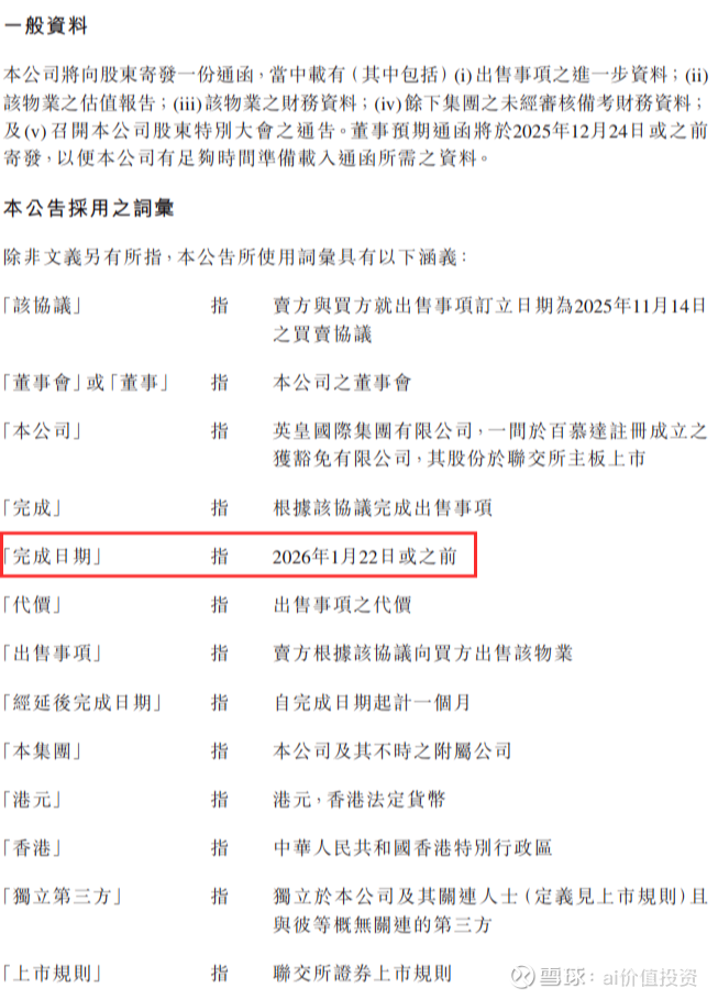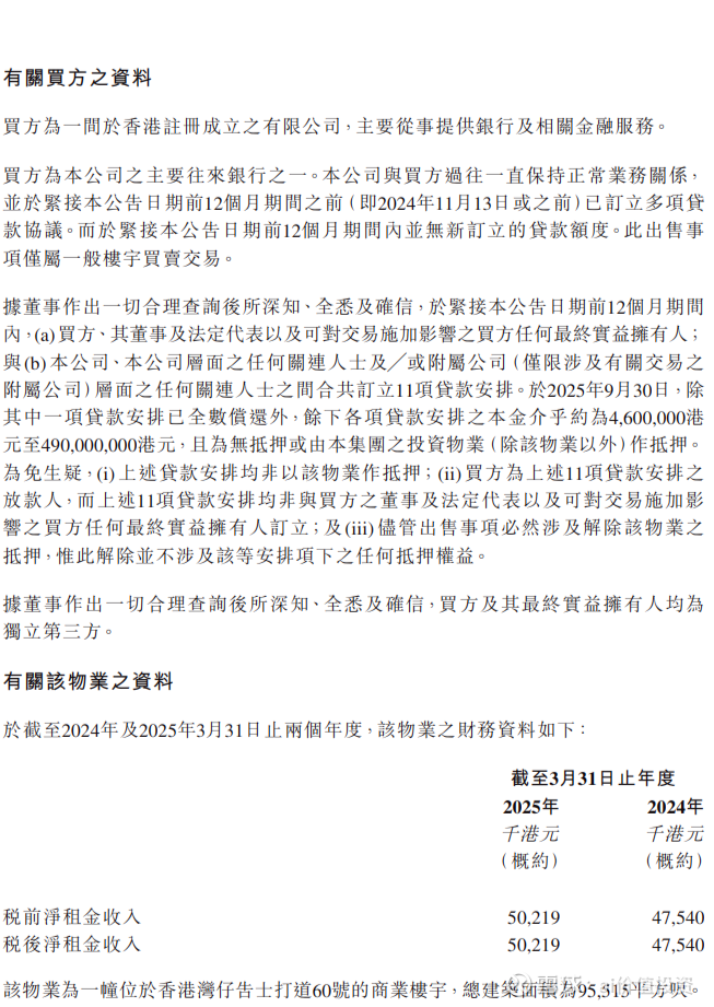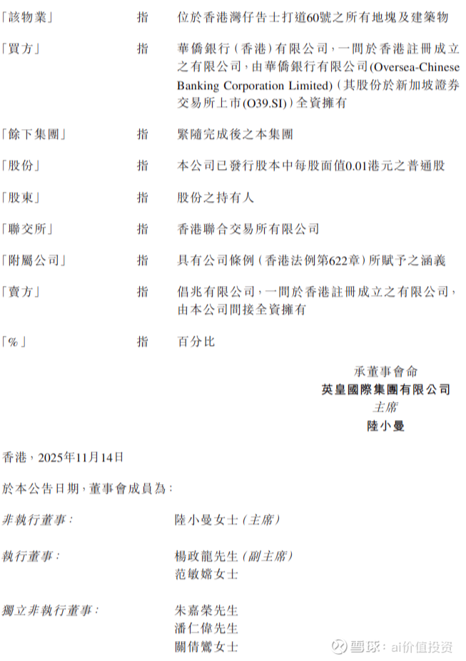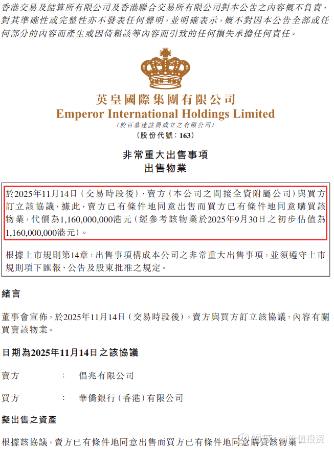 2025年11月14日,港股上市公司英皇国际 (00163.HK)发布《关于非常重大出售事项的公告》。公告内容显示,英皇国际要把旗下位于香港湾仔的一栋写字楼,以11.6亿港元(约人民币105,954.4万元)的价格,卖给华侨银行(香港)。华侨银行是英皇国际的主要往来银行之一,该公司之前向华侨银行贷款。
