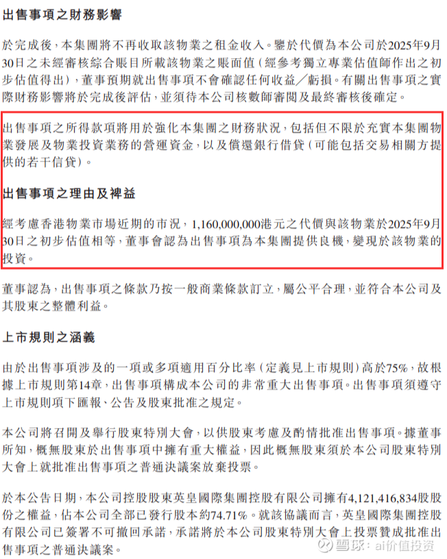 英皇国际认为当前香港房地产市场环境下,这是个好机会,可以把这栋楼的投资价值兑现成现金。卖楼得到的钱,会用来加强公司的财务状况,比如补充物业发展和投资的运营资金,以及偿还银行贷款。