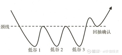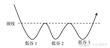 三重底形态由一系列在底部区域排列的有三个低点的K线组成。从一般 意义上来说,三重底是比W形底更加坚实的底部形态。股价进入底部区域后, 经过连续三次打压、两次反弹和三次拉升,才将空方实力耗尽。投资者通过 在底部反弹的两个高点画一条直线,就是三重底的颈线。股价向上突破颈线, 标志着三重底成立。如图所示。