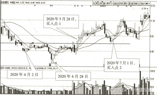 2020年4月30日,该股股价经过一段时间的盘整后放量向上突破了颈 线位置。至此,三重底形态正式成立,投资者可考虑跟进。