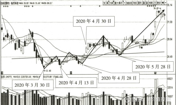 如图所示,2020年3月到5月,扬杰科技的日K线图上出现了三 重底形态。