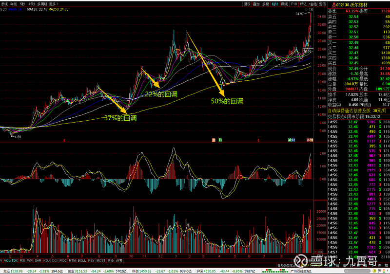 6-万通发展最近的经历已经告诉我们了,当利好出尽+技术顶部的时候,不要被未来巨大的利好预期选择一股不卖,也请尊重客观规律适当减仓应对可能的下跌。超过30%的跌幅一般人是割肉的,如果更狠一点跌50%,98%的人都会割肉认输离开,你们知道最近比较牛逼的沃尔核材吧,从4.66涨到了35,涨幅接近8倍,核心逻辑也很强,比数渡科技逻辑还要强,因为他市场技术和市场占有率都是已经跑出来,有很大的垄断性的,现在数渡科技产品还没有量产呢,现在你看他好牛,但是你们是否知道在上涨的途中,回调有多少吗,第一个回调是37%,第二个回调是22%,第三个回调达到接近50%的跌幅,扪心自问一下,这里有几个人能够拿住,这三个阶段你能抗住几个,很少能够抗住吧,但是不影响它是牛股!但是我知道有人真的抗住那就是坚信未来市值会达到好多,真的就是非卖品一路拿着,我反正做不到。这就是格局和认知更是知行合一的表现。现在的万通我们看成沃尔核材的第一个回调,这样安慰自己吧,毕竟逻辑就摆在那里,牛股不是一路涨上去的,而是一路颠簸上去的!