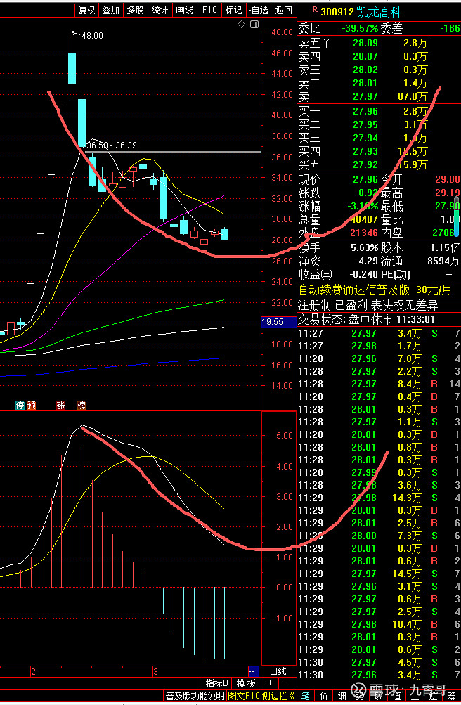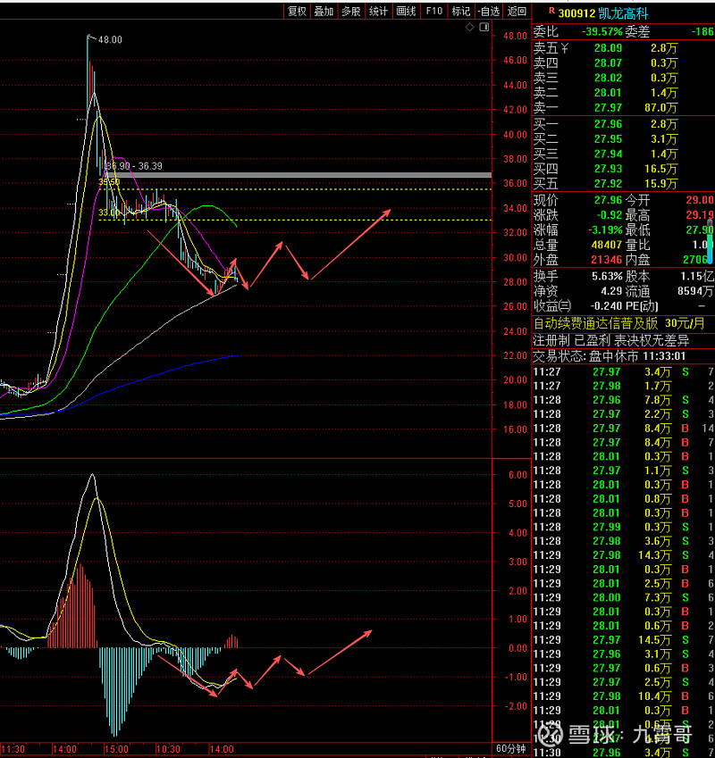 $凯龙高科(SZ300912)$ 只是从技术上简单说一下,上次预判60分钟MACD金叉会上涨,但是没有想到那么弱,涨幅不大,今天跌是正常的,跌是因为60分钟在做底背离,这个砸后会再次反弹,但是反弹力度估计也不会太大,如果强的话去32都问题不大,再次弱反弹后,60分钟还会再次底背离(就是说还要回调一下),股价震荡,最终震荡到日线快金叉,当 日线金叉那就是20%以上的大涨了。