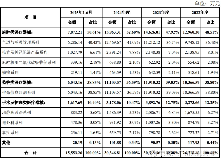 公司主营业务收入主要由三大类产品构成,收入结构清晰且聚焦核心领域。2024年,麻醉类产品实现收入1.6亿元,占营业收入比重约52.6%,是核心收入来源;监护类产品实现收入1.11亿元,占比约36.5%,增长势头强劲;手术及护理类产品实现收入0.33亿元,占比约10.9%,稳步拓展。境内外收入方面,公司以境内市场为核心,境外市场逐步突破,2025年上半年境内收入占比86.27%,境外收入占比提升至13.73%,其中集采产品收入占主营业务收入比例达15.45%,成为重要收入补充。