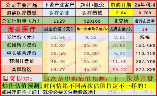 申购预测表是看重公司上市前的财务质地和行业前景,新股后期有波动是正常的,上市前一晚本号还有接盘炒作估值分析和策略,个人看法会随着资金的喜好和题材的发酵而改变前期观点(请关注本号每天复盘,会更新不同的估值分析观点)。请谨慎和理性参考,本文内容不做任何投资建议,据此操作风险自理。