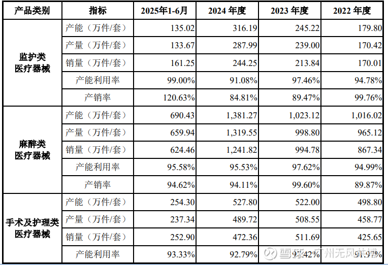 对比所有竞争对手,公司的核心优势主要体现在三个方面:一是细分领域专注度高,深耕麻醉、监护类耗材领域20余年,聚焦核心产品研发生产,技术积累深厚,在一次性使用压力传感器等细分产品上形成独特技术壁垒,参与6项行业标准、2项团体标准制定,行业话语权较强;二是渠道布局完善,境内覆盖31个省市,终端服务超千家三级医院,三甲医院渗透率高,境外通过FDA、CE认证,与美敦力等国际巨头合作,全球化布局逐步完善,2025年上半年境外收入实现稳步增长;三是产品性价比高,相较于国际巨头,公司产品价格具有明显优势,同时在安全性、数据精度上达到国际同类产品水平,相较于国内中小型企业,公司产品质量更可靠、技术更先进,形成差异化竞争优势。此外,公司2022-2024年核心产品产能利用率均超90%,近乎满产,2024年麻醉类、监护类产品产销率分别达94.11%、84.81%,生产与市场需求匹配度高,产能效率优势突出。