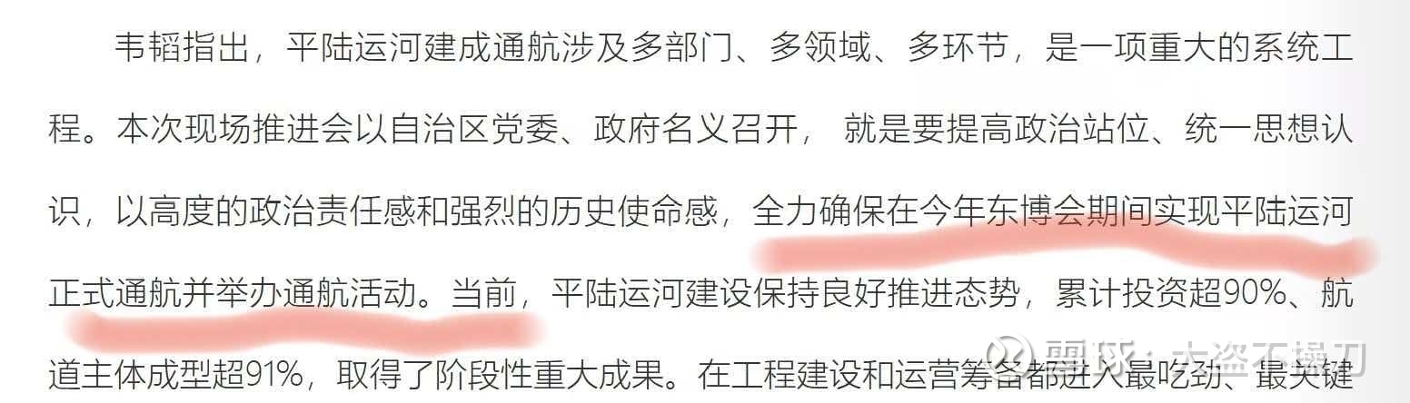 但2月25日广西政府召开平陆运河项目现场推进会,明确要求全力确保在2026年中国-东盟博览会期间实现平陆运河正式通航并举办通航活动。东盟博览会时间为9月17日-21日。