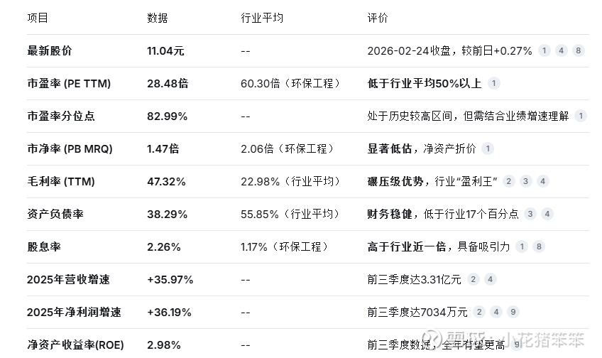 截至2026-02-24,股息率约2.26% ,显著高于环保工程行业平均的1.17% 。