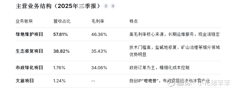 1. 高毛利密码:绿地养护业务占比近60%,毛利率高达46.36%,这类业务以长期运维服务为核心,如雄安新区项目,通过与政府及大型项目方签订长期服务协议,形成稳定现金流,边际成本随服务周期延长而降低 。