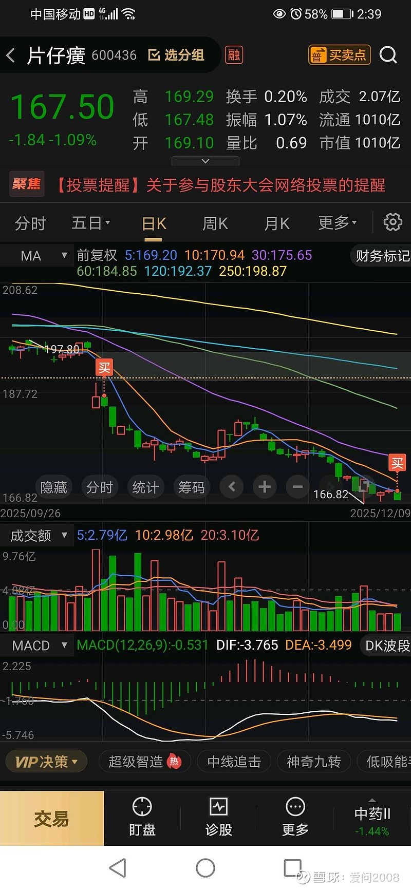 今天清仓非中药股,167.56元加仓300股片仔癀,后面准备每跌20元加300股片仔癀。目前持仓情况,大号满仓中药~云南白药(75%仓位)片仔癀(15%仓位)同仁堂(10%仓位),小号满仓中药~云南白药(77%仓位)同仁堂(23%仓位),持股待涨。少年不知中药好,中年方懂中药香!中药投资策略~只投护城河最深的公司(保密配方):片仔癀云南白药~国家绝密级配方,永久保密。(巴菲特:以合理的价格买入一家优秀的企业远胜过以便宜的价格买入一家平庸的企业;林园:主动做“乌龟”,“笨人笨办法”,“我也不知道什么时候会上涨,就一直在里面呆着”;闲大:待在几家优秀企业里,“熬”着就可以了;任俊杰名言:选对~拿住。)未来最看好中药板块,中药板块最看好云南白药片仔癀同仁堂,2035年前每天都满仓,云南白药锁仓,有钱就加片仔癀或同仁堂,希望10年后资产上台阶!个人投资记录,仅供参考!