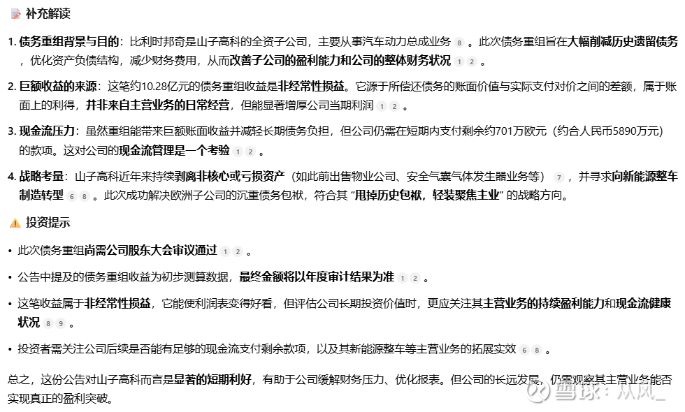 持仓:山子高科——竞价的时候看着有点不及预期,一路向下,但是最后10秒大单涌入,想着就算今天大资金(毛老板,养家老师,各位家人们)兑现,那也会有个冲高,周五的时候满仓山子,说实话有点压力,虽然我很看好山子。开盘后资金一路往上冲,有换手回踩,但是始终没破分时均线,在7-8点的位置充分换手,资金有进有出,分歧转一致,稳稳上板,而且今天相对来讲,整体大盘情绪不是很好,各位老师可以看下今天的涨跌家数和指数分时图,但是山子强势上板,今天还带动首开上板,算是主动和首开进行情绪分离,还是那句话,好票都是相互成就,不要拉一踩一,只有互相抬举,互相成就,高度才能更高,走的更远。板上出了一半,因为想开其他票了,而且满仓一个,确实压力大,盘后发公告,欧洲子公司债务重组,我直接用deepseek解读了下,算是利好,老师们看图: