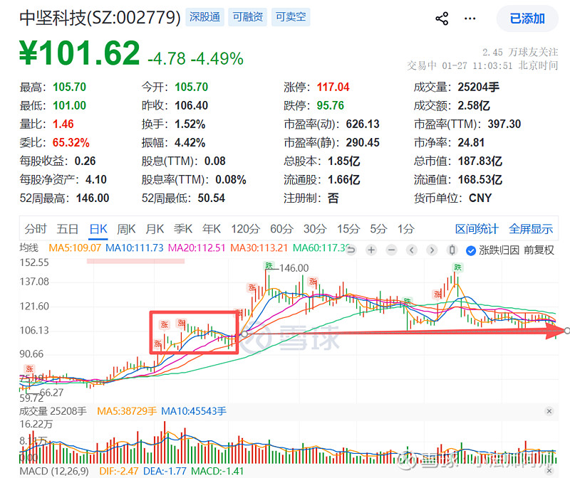 现在中坚这价位是前方筹码的密集成交区,看了一下之前雪球给的上涨归因,基本面上还是有题材支撑的,这位置形态企稳了,MACD也有底背离迹象,可能适合分批低吸