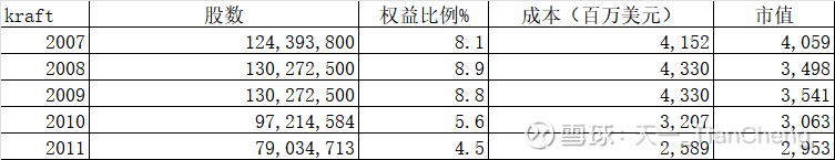 在2013年伯克希尔投资亨氏122.5亿美元之前的2007年,巴菲特就买入了卡夫食品,当时两家卡夫和亨氏还没有合并,甚至卡夫还没有将国际业务(食品)和北美业务(杂货)分拆。