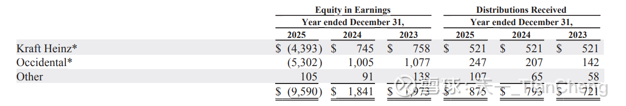 2025年第二季度,伯克希尔对持有的卡夫亨氏普通股投资计提了约50亿美元的税前减值损失。此外,2025年第四季度又对持有的西方石油公司普通股投资计提了约57亿美元的税前减值损失,合计107亿美元,产生的原因(按照权益法)如下:
