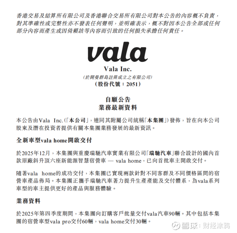 公司情报专家《财经涂鸦》获悉,2026年1月1日,VALA集团(2051.HK)披露2025年第四季度自愿经营数据。