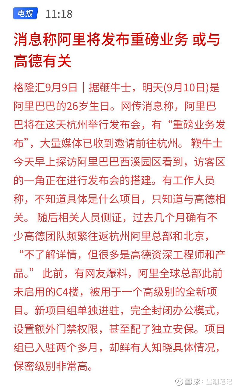 明天(9月10日)是阿里巴巴的26岁生日。网传消息称,阿里巴巴将在这天杭州举行发布会,有“重磅业务发布”,据传与高德相关,大量媒体已收到邀请前往杭州。四维图新(002405):国内高精地图龙头,为高德提供道路数据和PO1信息,技术覆盖全流程。吉宏股份(002803):跨境电商龙头,与高德合作推广多语言地图在跨境购物中的应用。$阿里巴巴-W(09988)$ $四维图新(SZ002405)$ $吉宏股份(SZ002803)$
