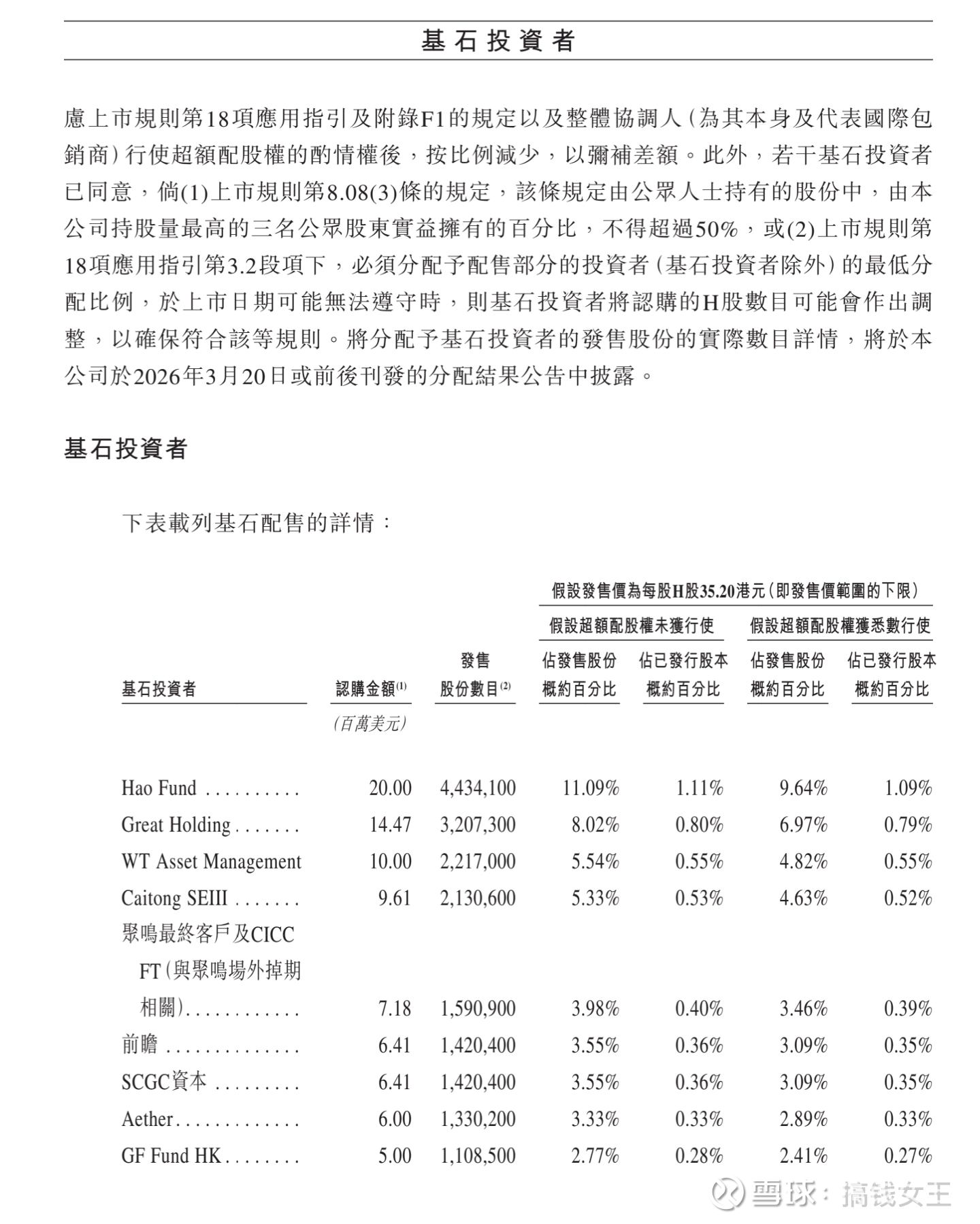 5.基石投资者:阵容坚实,已引入Hao Fund、WT Asset Management、深创投(SCGC)、聚鸣投资、凯丰等多家知名机构作为基石投资者。