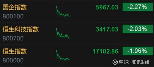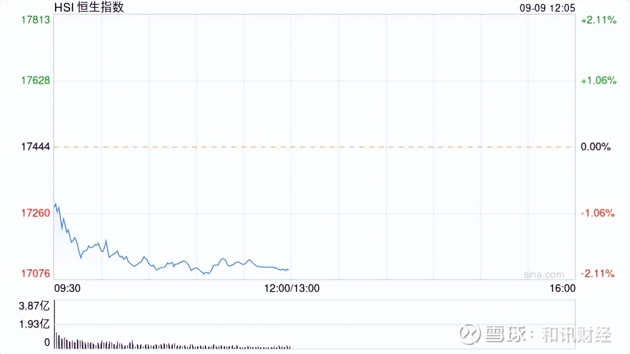 9月9日消息,港股三大指数低开低走,截至午间收盘,恒生指数跌1.96%,报17102.86点,恒生科技指数跌2.03%,国企指数跌2.27%。盘面上,科网股普遍低迷,京东、腾讯、阿里巴巴、小米、网易跌超1%;石油股跌幅居前,中石油跌超6%;内房股齐挫,美的置业跌超12%;黄金股集体走低,山东黄金、紫金矿业跌超4%;停牌长达近一年半的华兴资本控股今日复牌,现跌超66%。