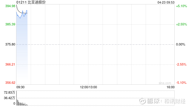 比亚迪股份(01211)早盘高开逾6%,截至发稿,股价上涨3.73%,现报389.80港元,成交额14.90亿港元。