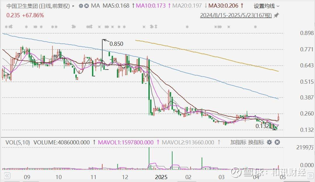 格隆汇5月23日|中国卫生集团(0673.HK)今日复牌高开,盘初一度涨85.71%,报0.26港元,唯成交较淡,截至目前仅成交不到百万港元。
