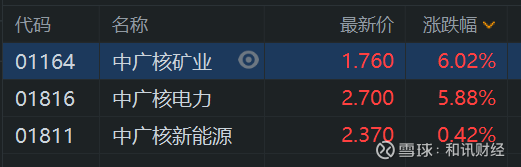 格隆汇5月26日|港股核电股集体拉升走高,其中,中广核矿业一度涨超7%,中广核电力涨近6%,中广核新能源跟涨。