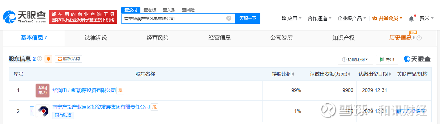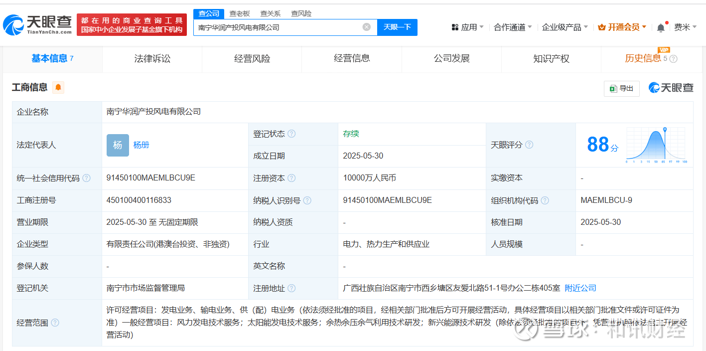 天眼查App显示,近日,南宁华润产投风电有限公司成立,法定代表人为杨册,注册资本1亿人民币,经营范围包括风力发电技术服务、太阳能发电技术服务、余热余压余气利用技术研发、新兴能源技术研发等,由华润电力新能源投资有限公司、南宁产投产业园区投资发展集团有限责任公司共同持股。