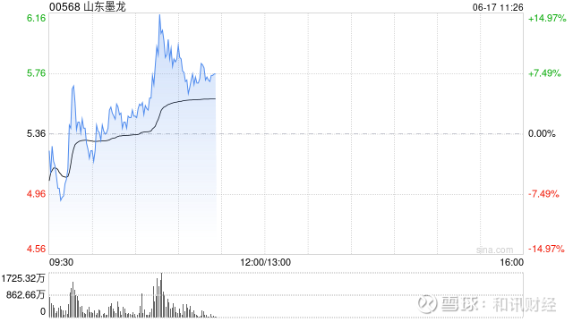 山东墨龙(维权)(00568)早盘转涨最高逾14%,盘初一度下跌逾8%。该股自6月13日起放量飙升,至今三个交易日累涨逾1.6倍。截至发稿,股价上涨6.16%,现报5.69港元,成交额23.10亿港元。