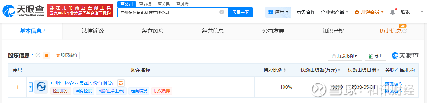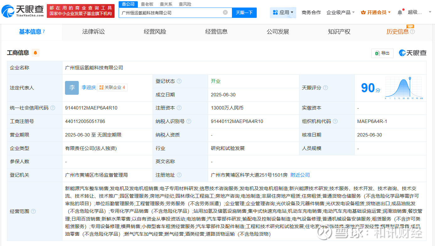 天眼查App显示,近日,广州恒运氢能科技有限公司成立,法定代表人为李迎庆,注册资本1.3亿人民币,经营范围包括新能源汽车整车销售、新兴能源技术研发、电池制造等。股东信息显示,该公司由穗恒运A(000531)全资持股。