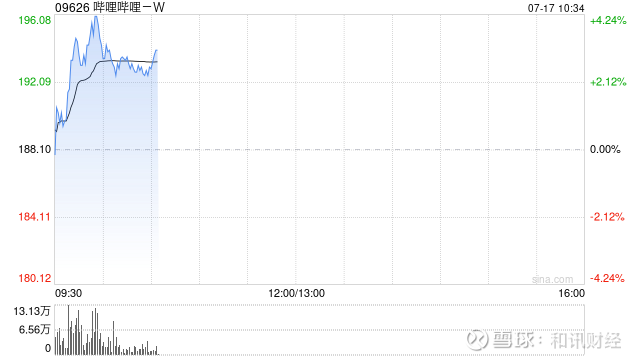 哔哩哔哩-W(09626)盘中涨超4%,截至发稿,股价上涨3.14%,现报194港元,成交额5.07亿港元。