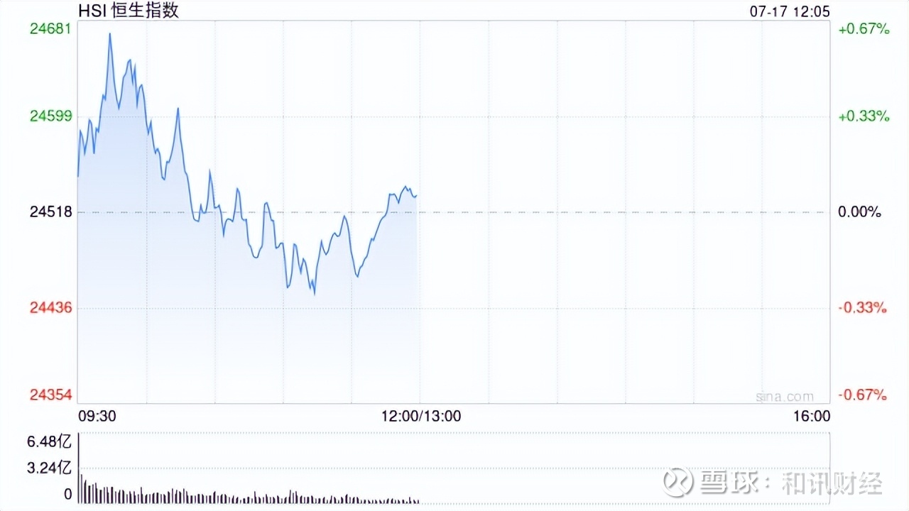 7月17日消息,港股三大指数集体上涨。截至午间收盘,恒生指数涨0.07%,报24534.84点,恒生科技指数涨0.29%,国企指数涨0.05%。盘面上,科网股涨跌不一,哔哩哔哩涨超4%,美团涨超1%,百度跌超3%,小米集团超1%;创新药概念走强,康方生物、三生制药等多股创新高;加密货币概念股部分大涨,蓝港互动涨超37%;芯片股活跃,芯智控股涨超4%;黄金股走弱,山东黄金跌超2%。