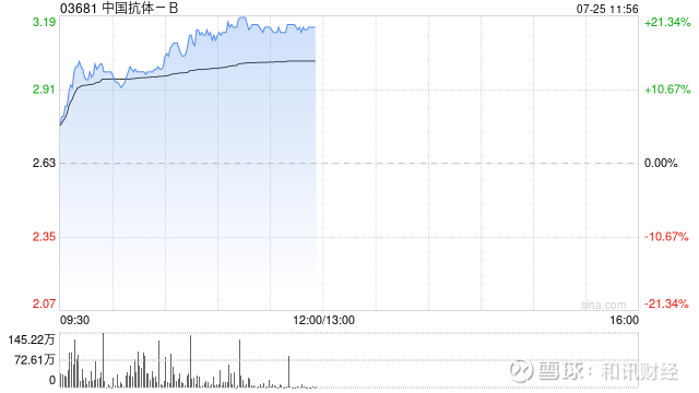 中国抗体-B(03681)盘中涨超20%,截至发稿,股价上涨19.01%,现报3.13亿港元,成交额1.17亿港元。